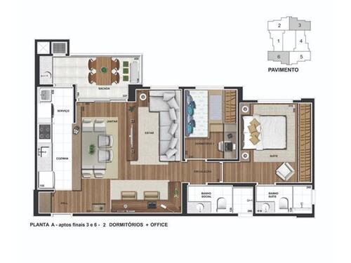 Distribuição Interna (planta padrão): 3 dormitórios (1 suíte), varanda com churrasqueira.