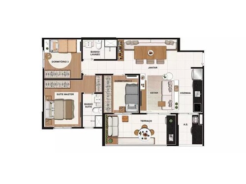 Distribuição Interna (padrão): 3 dormitórios (1 suíte). -