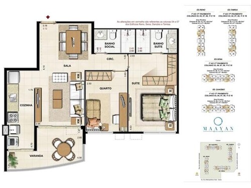 Distribuição Interna: 2 dormitórios (1 suíte), sala de estar e jantar com varanda, banheiro social, cozinha e área de serviço.