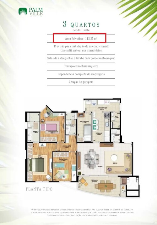 Área útil: 13,37m² (conf. matrícula); 113,37m² (conf. site construtora)