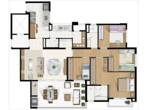 Distribuição Interna (planta padrão): 4 dormitório (1 suíte), banheiro social, sala de estar, sala de jantar, varanda gourmet, lavabo, cozinha, lavanderia, despensa e wc de serviço.