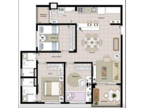 Distribuição Interna: sala de estar/jantar, terraço, cozinha/área de serviço, circulação, 01 suíte, 02 dormitórios e 01 banheiro;