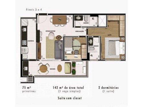 Distribuição Interna: 2 dormitórios (1 suíte)